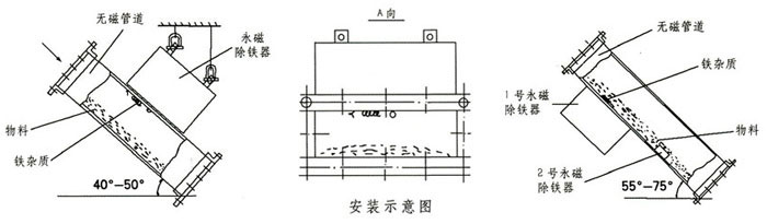 RCYA管道永磁除鐵器包括無磁管道和永磁鐵兩部分,專用于對封閉管道內非磁性物料的除鐵,永磁除鐵器內部采用高性能稀土強磁材料組成復合磁系。具有體積小、磁力大、重量輕、除鐵干凈、方便、無能耗、使用壽命長等特點。適合沒有輸送皮帶,只能提供下料溜槽的場合。當散狀物料經(jīng)過管道式永磁除鐵器時,鐵雜物被高場強的永磁鐵所吸附,清除鐵雜質時,打開管道專用門將雜質取除。該設備適用于含鐵量較少的場合,含鐵較多的場合應選用自卸式除鐵器。主要應用于水泥、化工、煤炭、塑料、耐火材料、建材、造紙等行業(yè)的下料管道中清除鐵雜物。